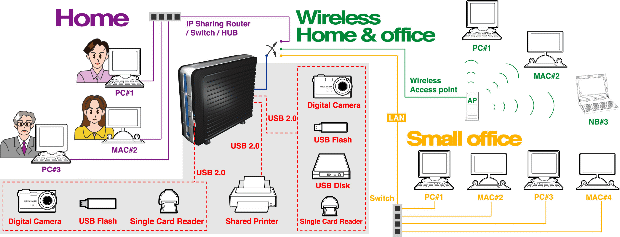 a sdílení USB tiskárny. Lze využít i jako FTP server, data lze tedy využívat i vzdáleně přes internet.