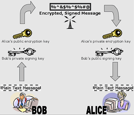 Bob chce poslat, bezpečně, zprávu Alici. Digitálně podepíše zprávu privátním