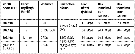 dle standardu IEEE 802.11a/b/g (zkráceně jen 802.11a, 802.11b, 802.11g).
