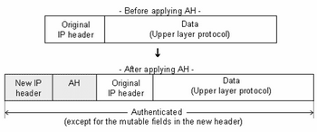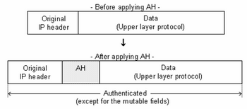 pásma. Mezi IP hlavičku a data se přidává AH (Authentification Header):